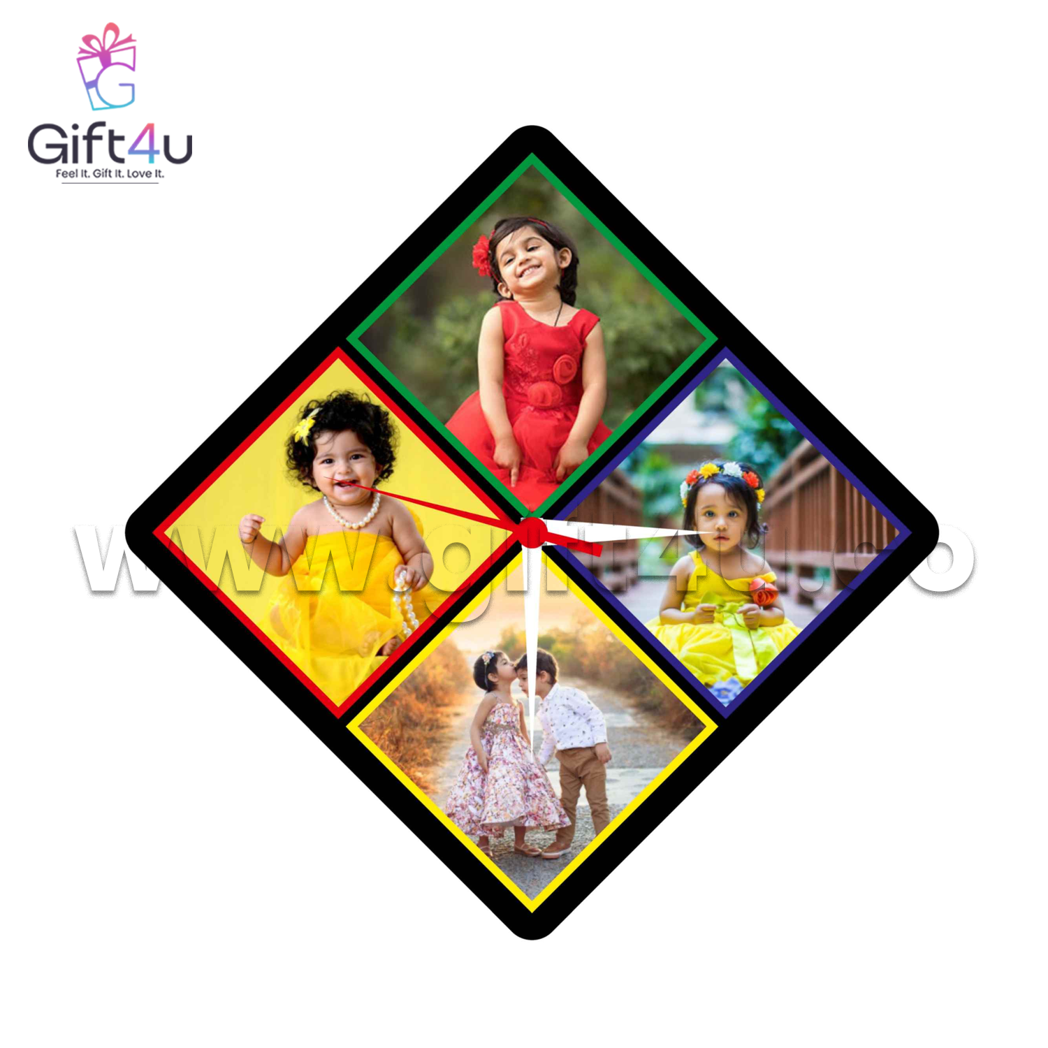 Add a colorful and personal touch to your walls with our Timeless Treasures Photo Clock. Designed in a diamond shape with 4 photo slots, this piece functions both as a decorative wall clock and a frame for your favorite memories. Crafted from durable 5mm MDF, this clock is ideal for bedrooms, kids’ rooms, or as a thoughtful gift that blends utility with emotion.