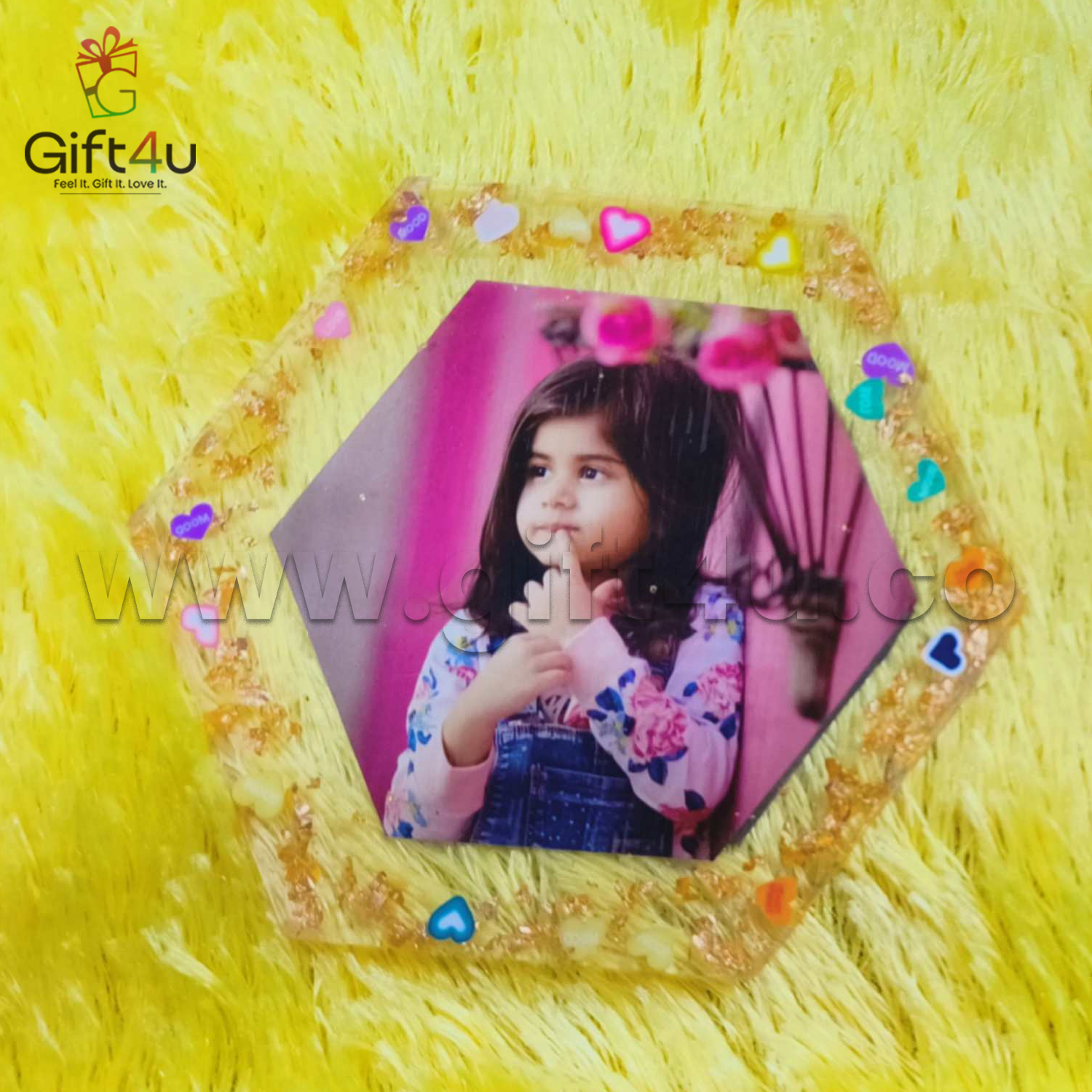 Bring a touch of charm and color to your space with our SparkleHex Resin Magnet – a uniquely designed 4x4 inch hexagon magnet that beautifully encases your favorite photo in crystal-clear resin. Decorated with mini heart embellishments and glitter, this magnet adds a joyful and personalized sparkle to any magnetic surface. A perfect keepsake that holds your memories, quite literally, close to home.