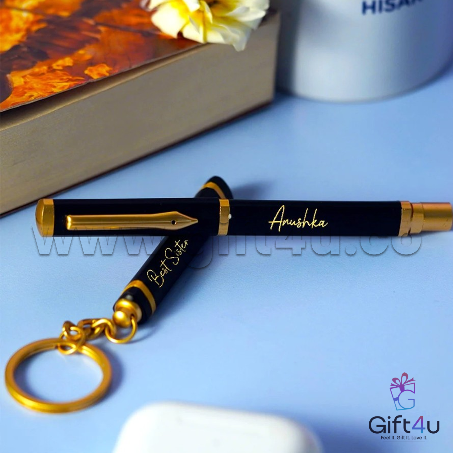 A gift that speaks from the heart! The GoldAura Personalised Combo features a premium black-and-gold pen and matching keychain, both engraved with your custom name or message in elegant gold script. Stylish, sentimental, and perfect for every occasion.