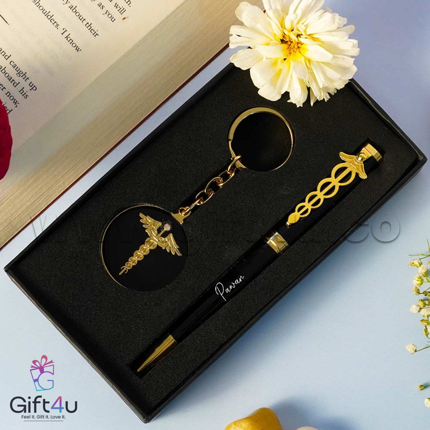 Celebrate the dedication of doctors and medical heroes with the MediElite Personalized Combo. Featuring a sleek black & gold pen and a keychain engraved with the iconic caduceus symbol, this set includes your name on the keychain's back. A classy and meaningful gift for healthcare professionals.