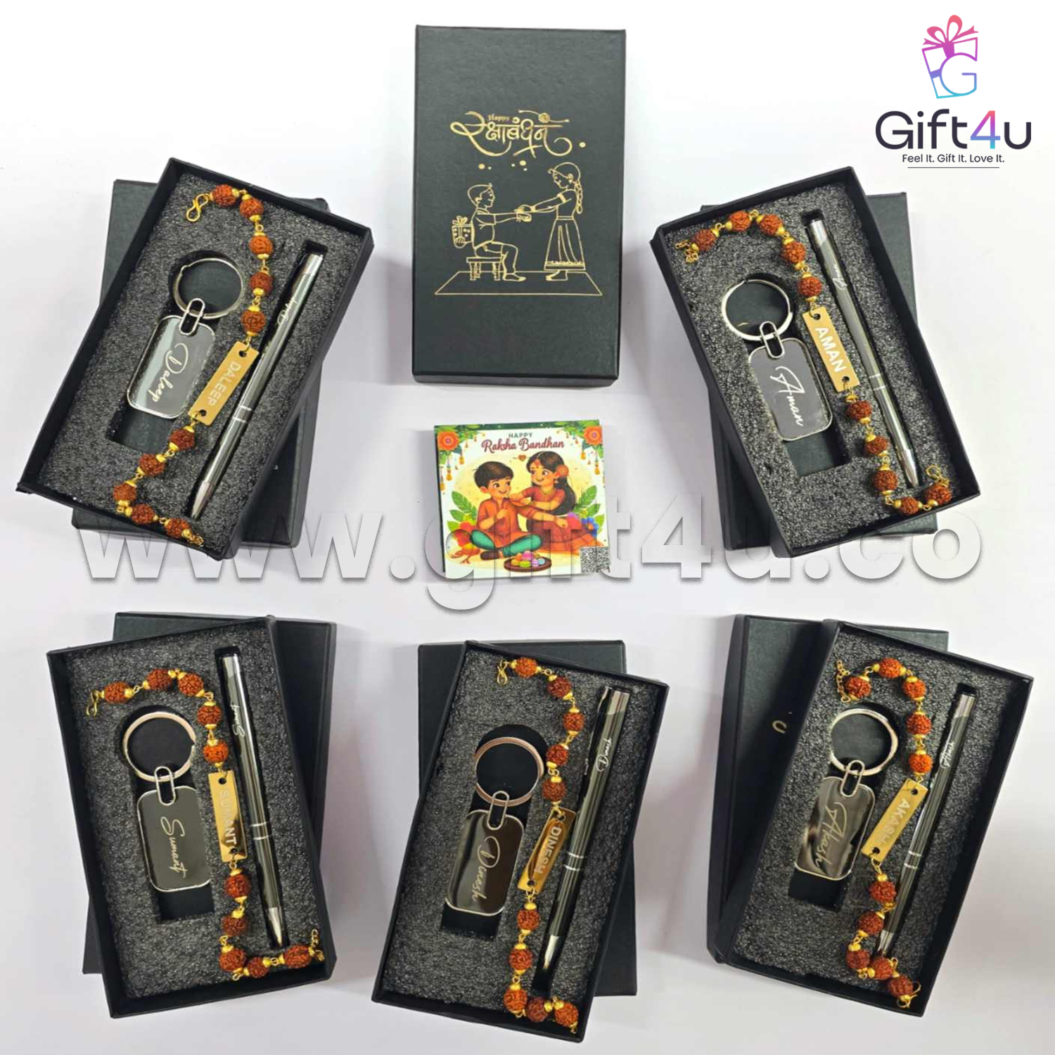 Celebrate the unbreakable bond of love this Raksha Bandhan with the Bandhan Box – Rakhi Edition. Thoughtfully curated, each box includes a beautifully handcrafted Rudraksh Rakhi, a personalized metal pen, and a matching engraved keychain—making it a stylish and sentimental gift for your brother. Packed in a premium keepsake box, it’s more than a gift—it’s a memory.