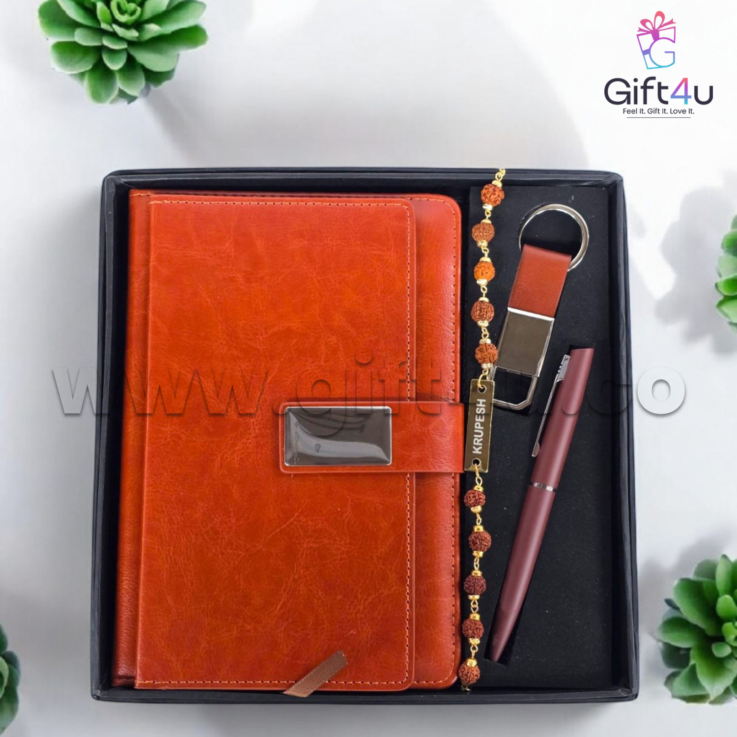 This Raksha Bandhan, go beyond the ordinary with the Bonded Moments Premium Rakhi Gift Set — a luxurious, customisable combo designed to celebrate the timeless bond between siblings. Featuring a rich leather-finish diary with a magnetic lock, an engraved metal keychain, a smooth customized pen, and a sacred Rudraksh Rakhi — all neatly presented in a premium gift box. This is the perfect blend of tradition, utility, and elegance.