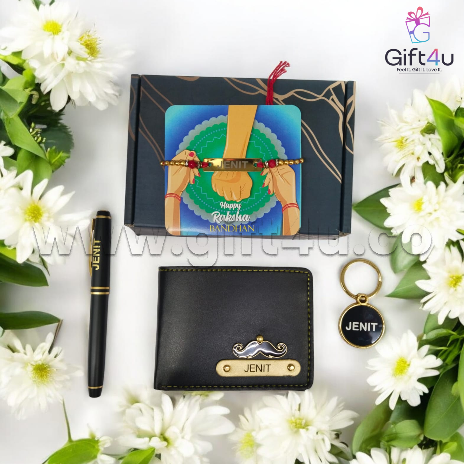 Celebrate Raksha Bandhan with elegance and meaning through The Signature Bond Set. This premium combo features a custom name Rakhi tied with tradition, a stylish wallet, a sleek metal pen, and a matching keychain — all personalized with your brother’s name. A classy and heartfelt way to show love, appreciation, and care.