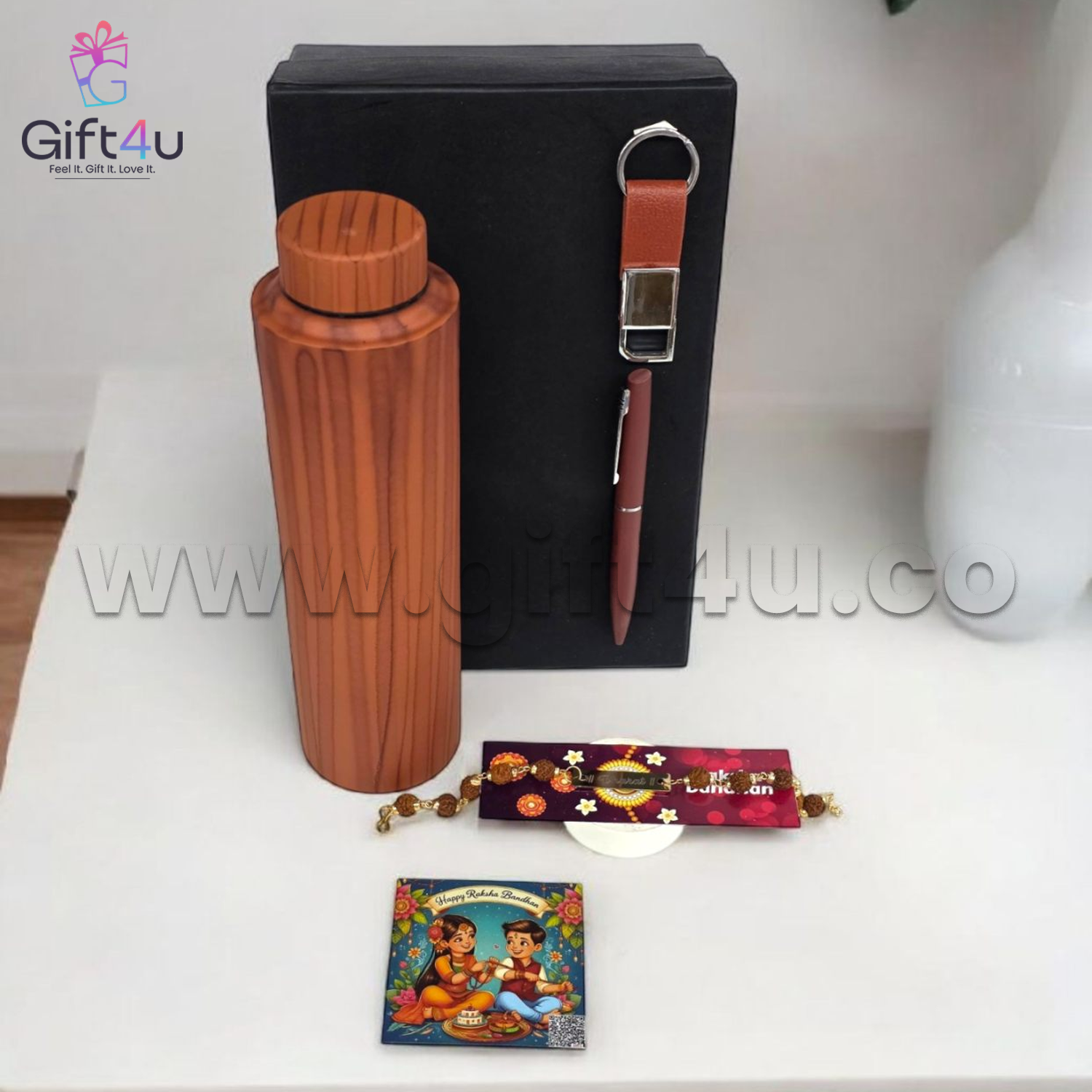 Celebrate the timeless sibling bond with the Rustic Bond Rakhi Set — a thoughtfully curated gift that’s both elegant and useful. Featuring a natural wood-finish bottle, sleek pen, premium leather keychain, and a traditional Rakhi, this combo is a perfect mix of functionality and festive warmth. Ideal for brothers who appreciate practical yet meaningful gifts.
