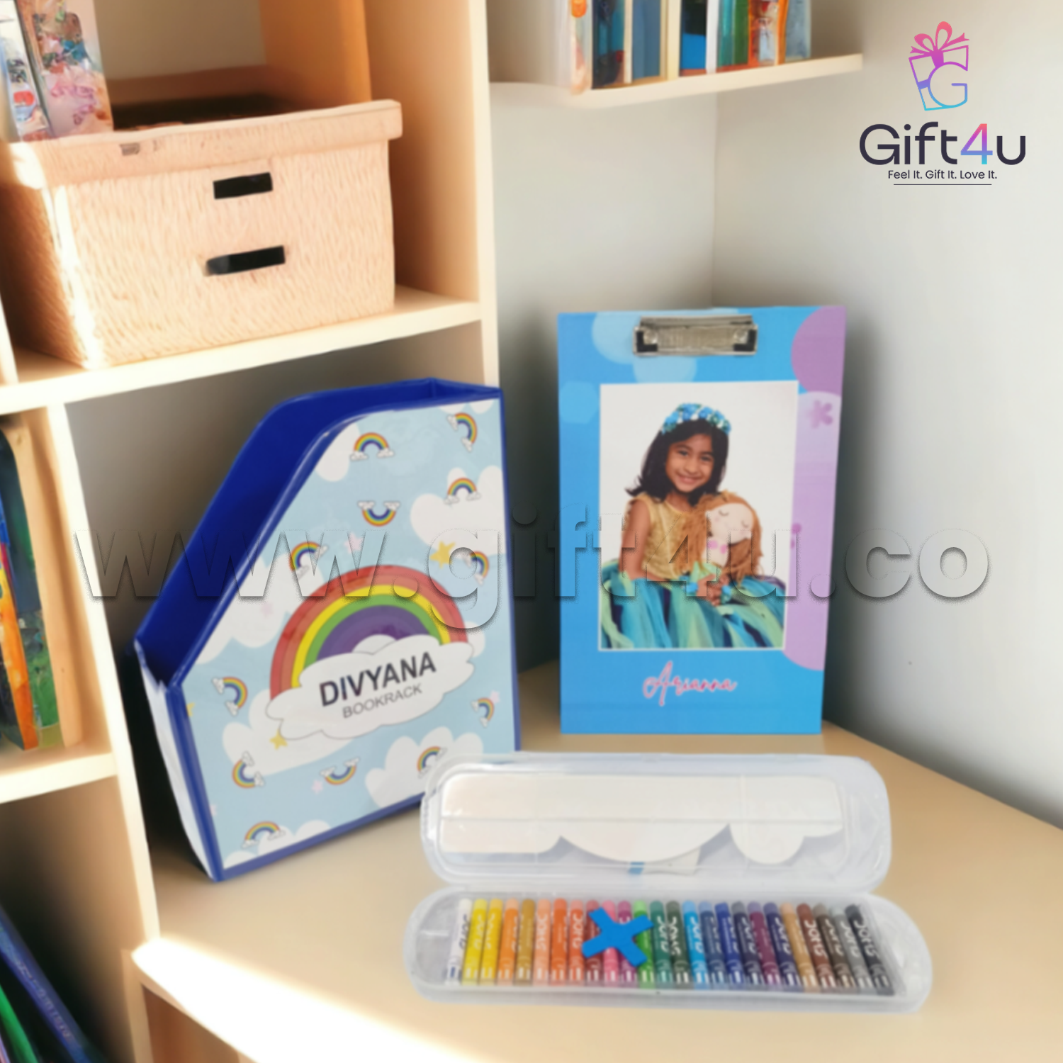 This colorful combo set is perfect for young minds who love to learn, draw, and explore. With a personalized book rack, a fun writing pad mat, and a 25-shade crayon set, this kit is ideal for daily study, homework, or artistic playtime.