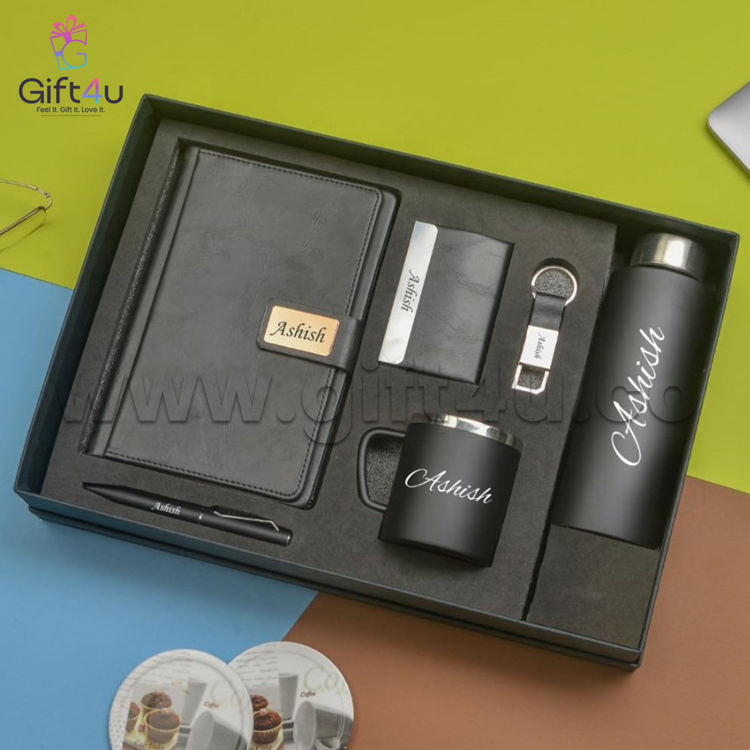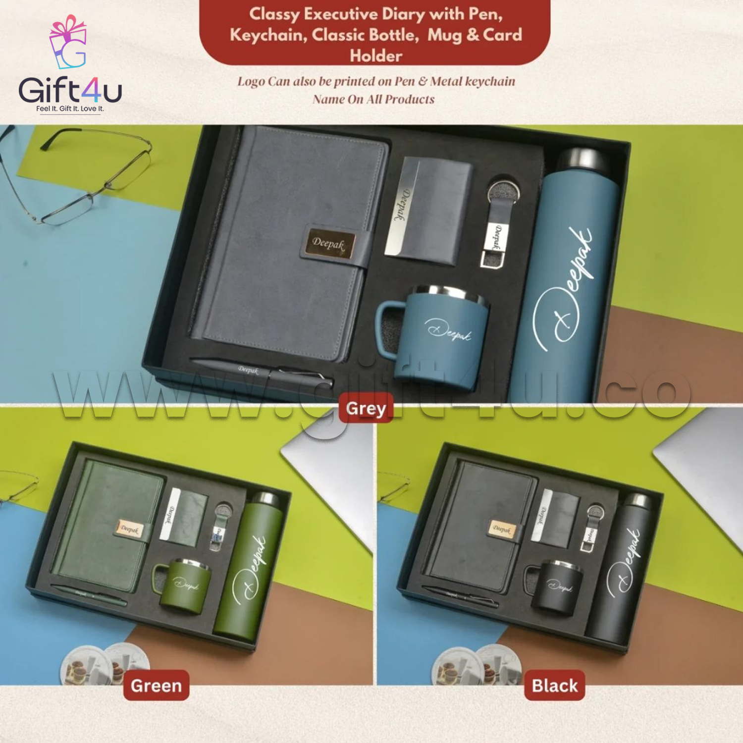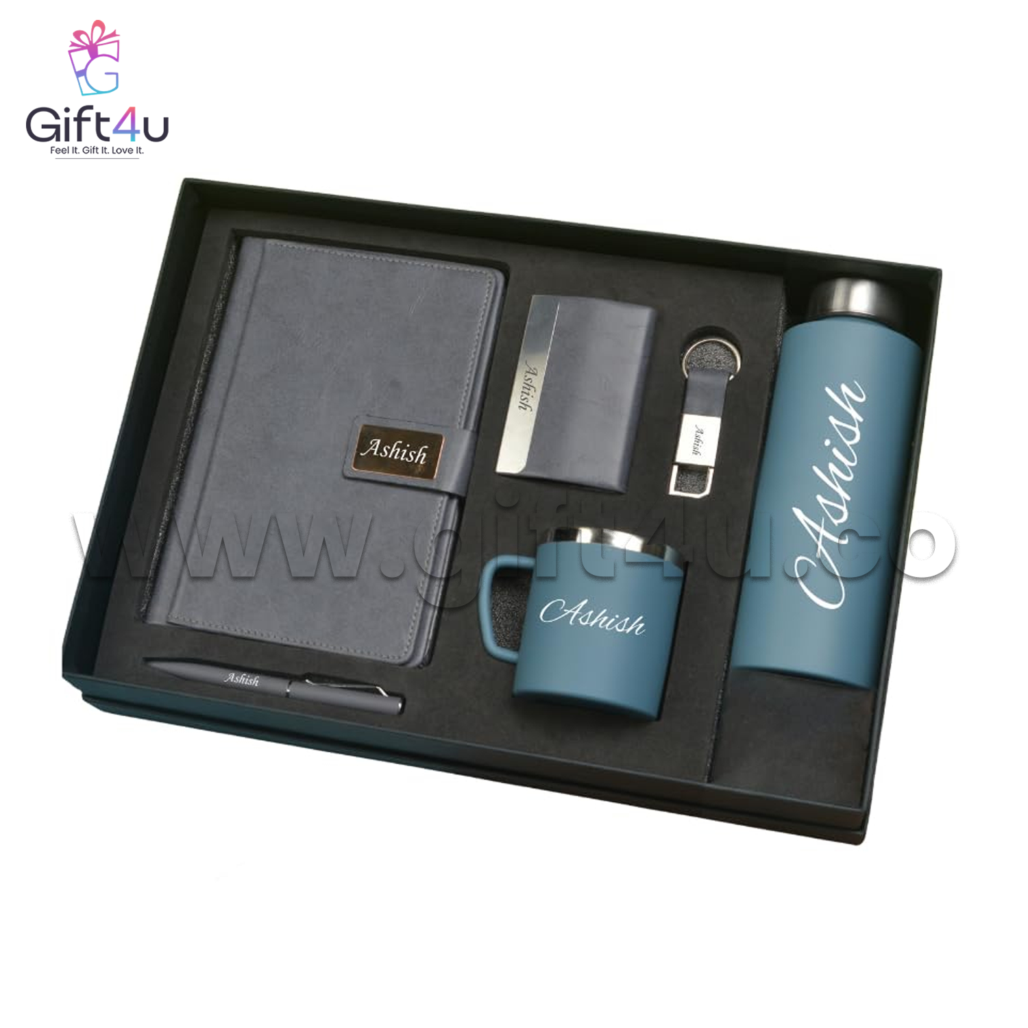 The ExecuBlack Premium Kit is a luxurious 6-in-1 gift set crafted to reflect class, elegance, and personal value. Perfectly suited for professionals, leaders, or new team members, this black-themed executive combo blends premium materials with full personalization—making every recipient feel valued and recognized. From a sleek smart bottle to a sophisticated diary, every item bears the personal name or branding, turning a useful gift into a treasured keepsake.