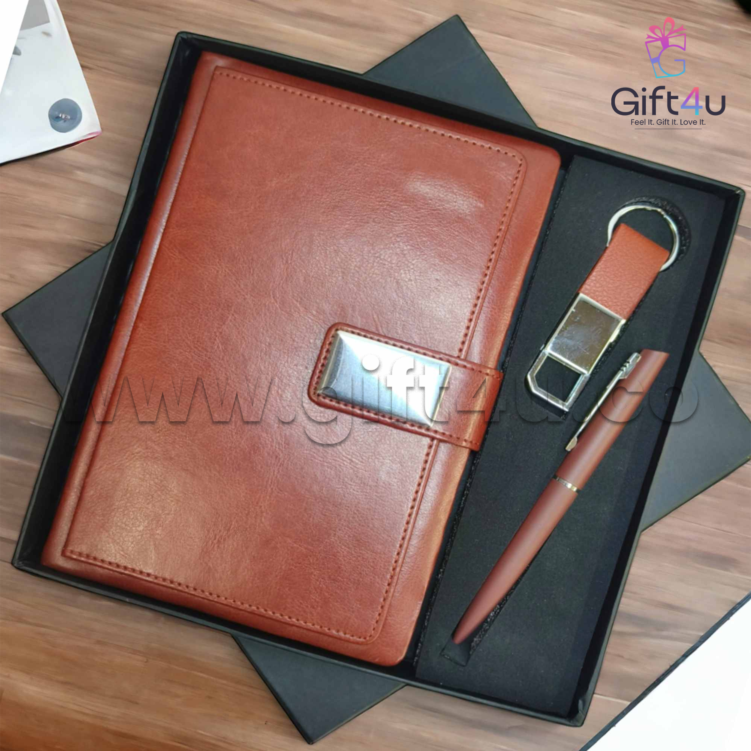 The RegalEdge™ Classic Set is crafted for professionals who appreciate timeless elegance and personalized touches. Featuring a rich brown leatherette diary with a magnetic clasp, a matching matte-finish pen, and a leather-accented keychain, this trio exudes class, practicality, and thoughtfulness.